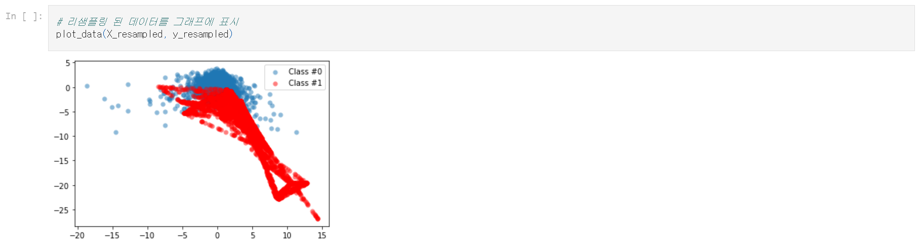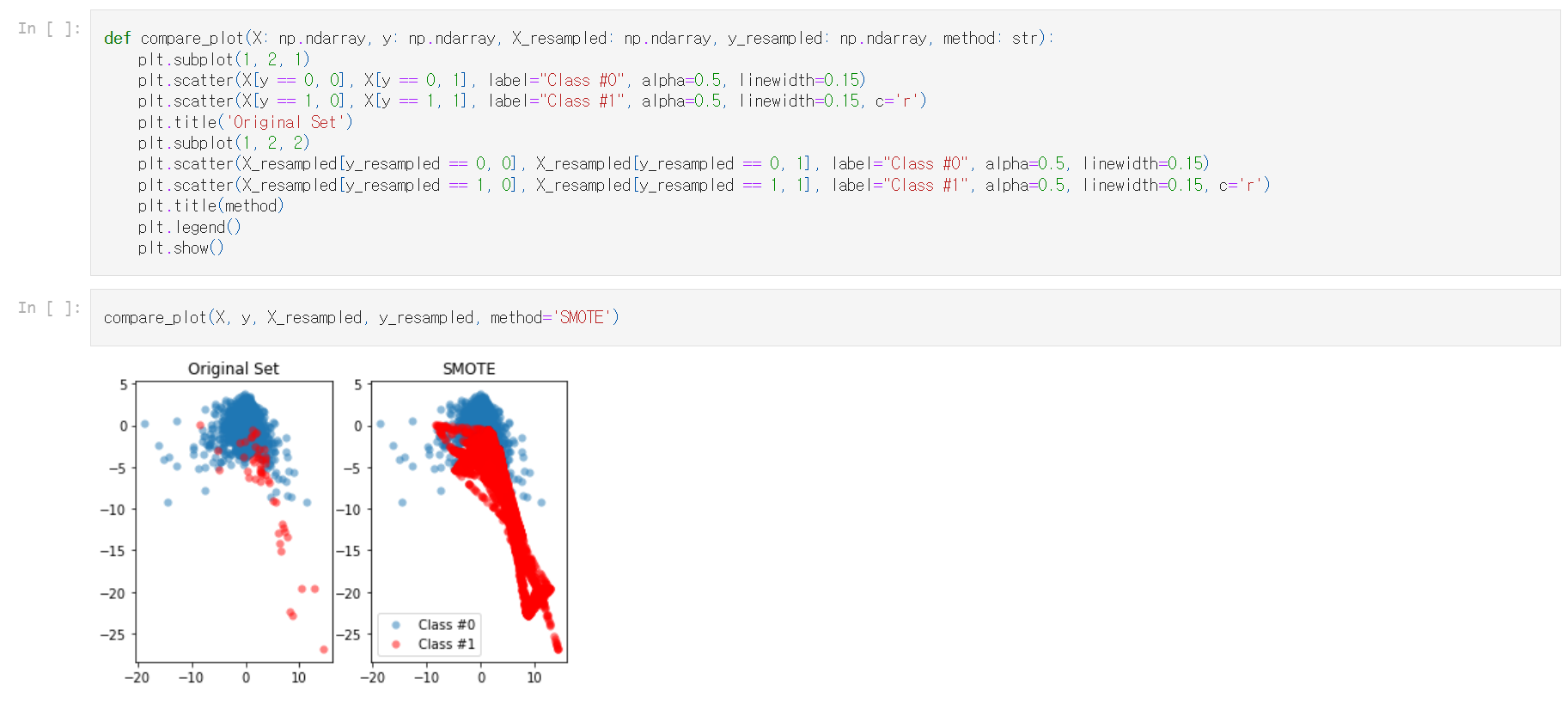 | ※ 오버샘플링 방법을 이용함으로써 중복 샘플이 생성되어 원래의 그래프에 비해 점이 진하게 표시된다. |