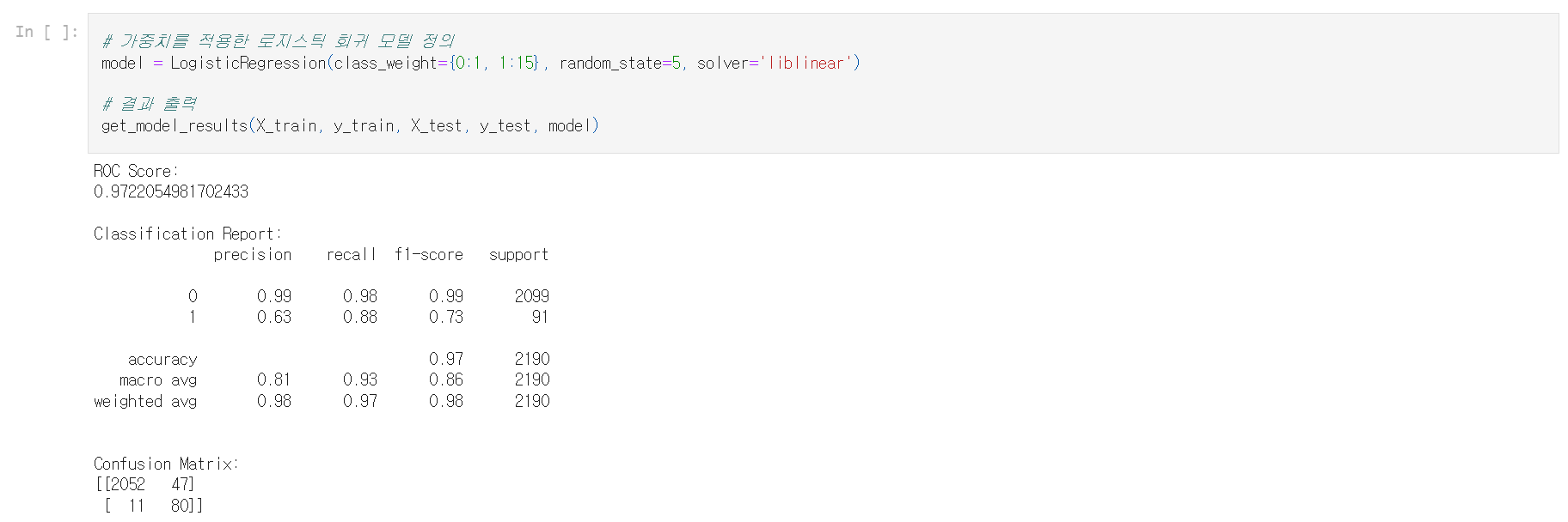- 부정거래 클래스 가중치 1:15로 LogisticRegression 모델을 정의