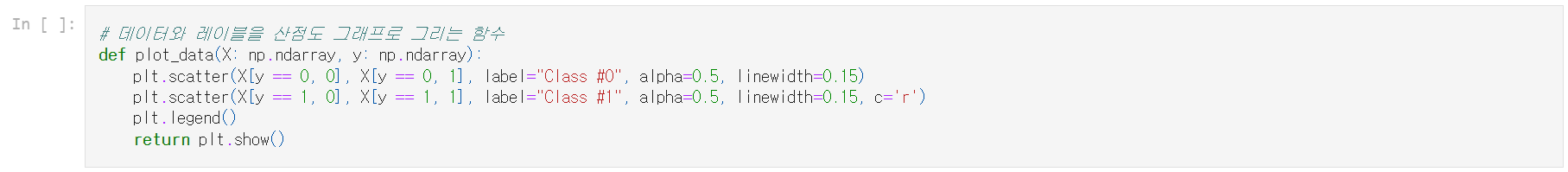 - X와 y의 산점도 그래프를 그리기 위하여 plot_data(X, y) 함수를 정의