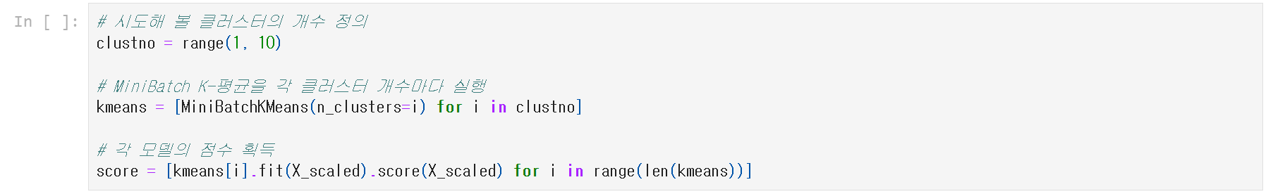 - 리스트컴프리헨션을 사용해 모든 클러스터 수에 대해서 MiniBatch K-means를 실행
