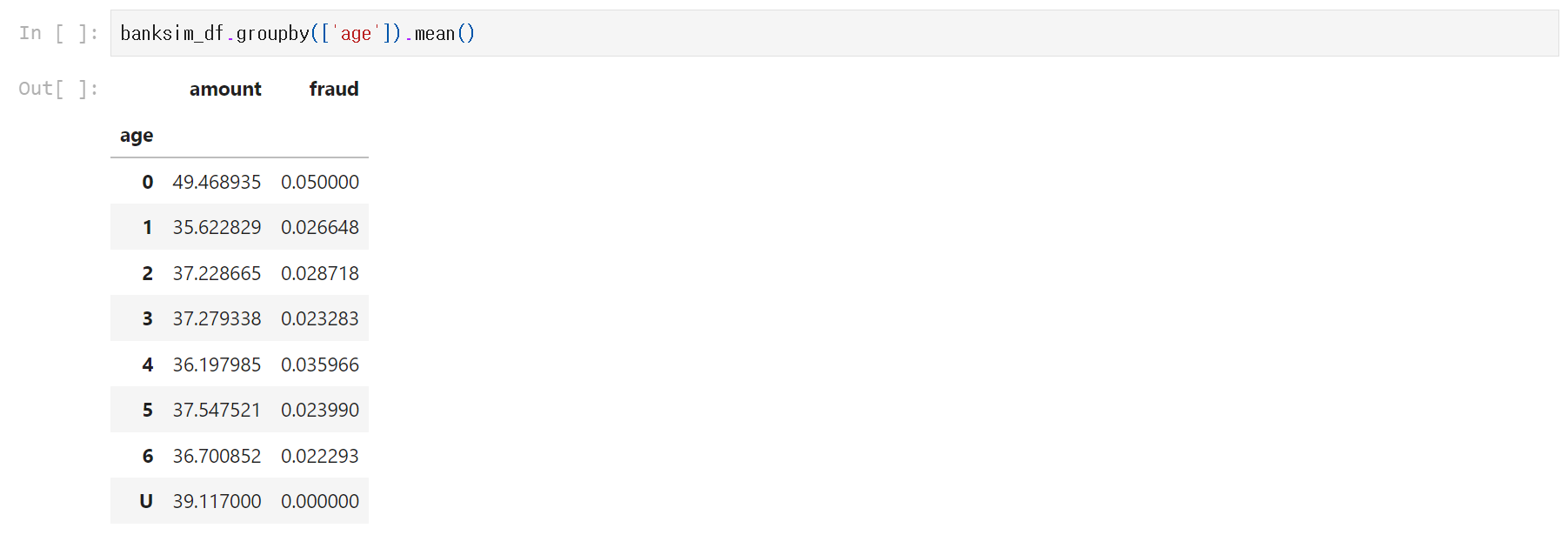 평균 지출 금액과 부정거래 비율은 그룹 간에 다소 비슷하다. 연령 그룹 '0'이 눈에 띄지만 40건에 불과하기 때문에 별도의 그룹으로 나누어 별도의 모델을 운영하는 것은 말이 안 된다.