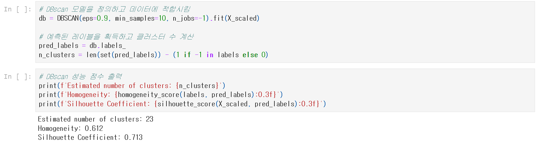 - 두 샘플 사이의 최대 거리를 0.9로 설정하고 클러스터의 최소 관측치를 10으로 설정하여 DBSCAN 모델을 초기화