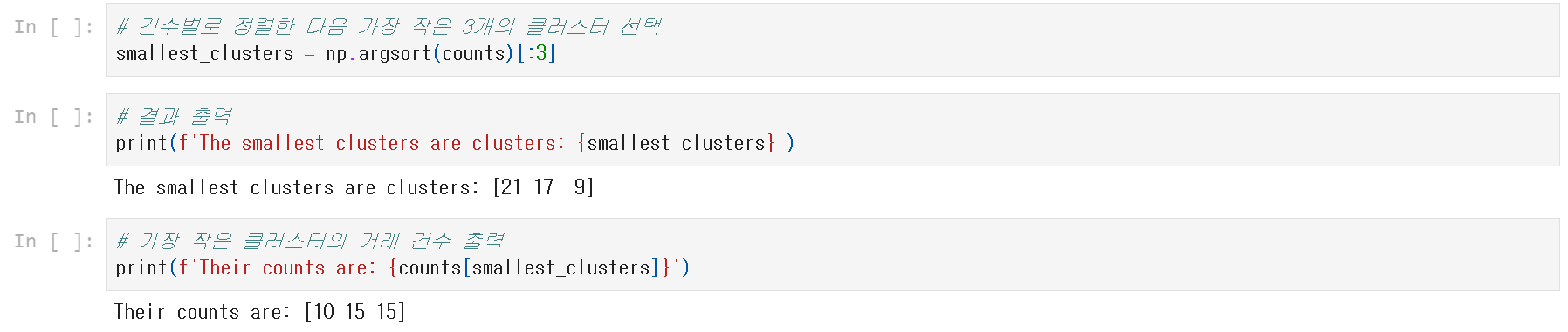 - 먼저 클러스터의 크기를 파악하고 가장 작은 클러스터를 필터