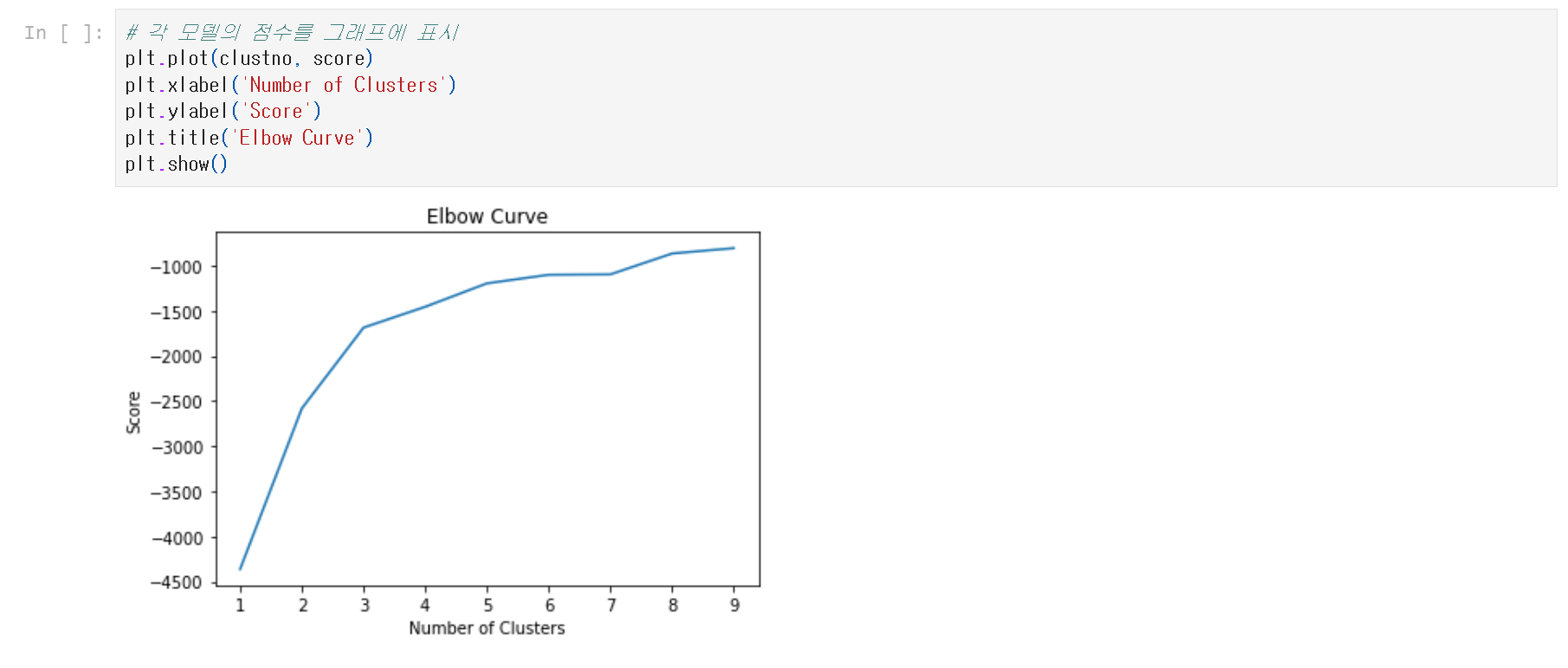 - 클러스터 개수와 점수를 그래프에 나타냄