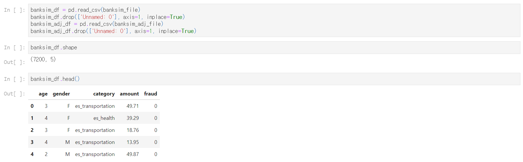 여기에서는 은행 이체 거래 데이터를 살펴본다. 거래는 지출 유형과 지출 금액에 따라 분류되며, 연령, 성별 같은 몇 가지 특성을 사용할 수 있다. 일부 거래는 부정거래로 분류되며, 레이블은 결과를 검증하는 데 사용한다.