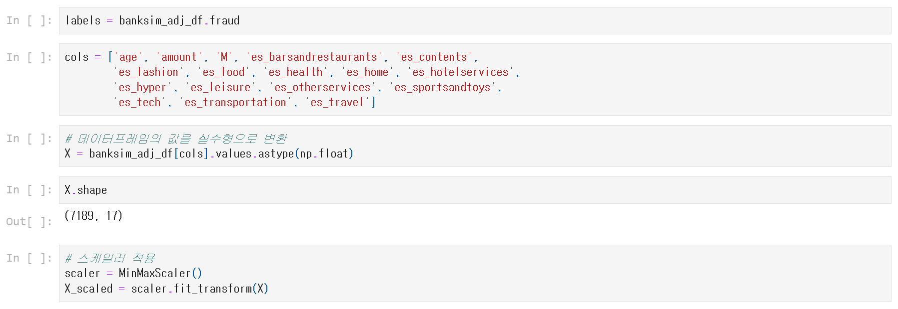 - 정의된 스케일러를 X에 적용하여 모든 값이 0과 1 사이에 있도록 정규화된 X_scaled을 획득