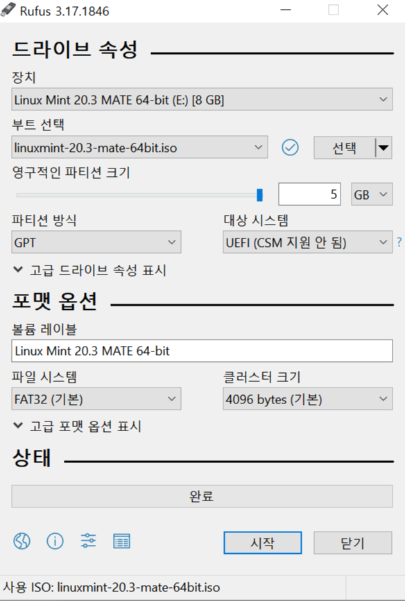 이제 rufus를 실행해보자. 몇 가지 설정을 마친 뒤에 하단의 "시작" 버튼을 누르면 된다.