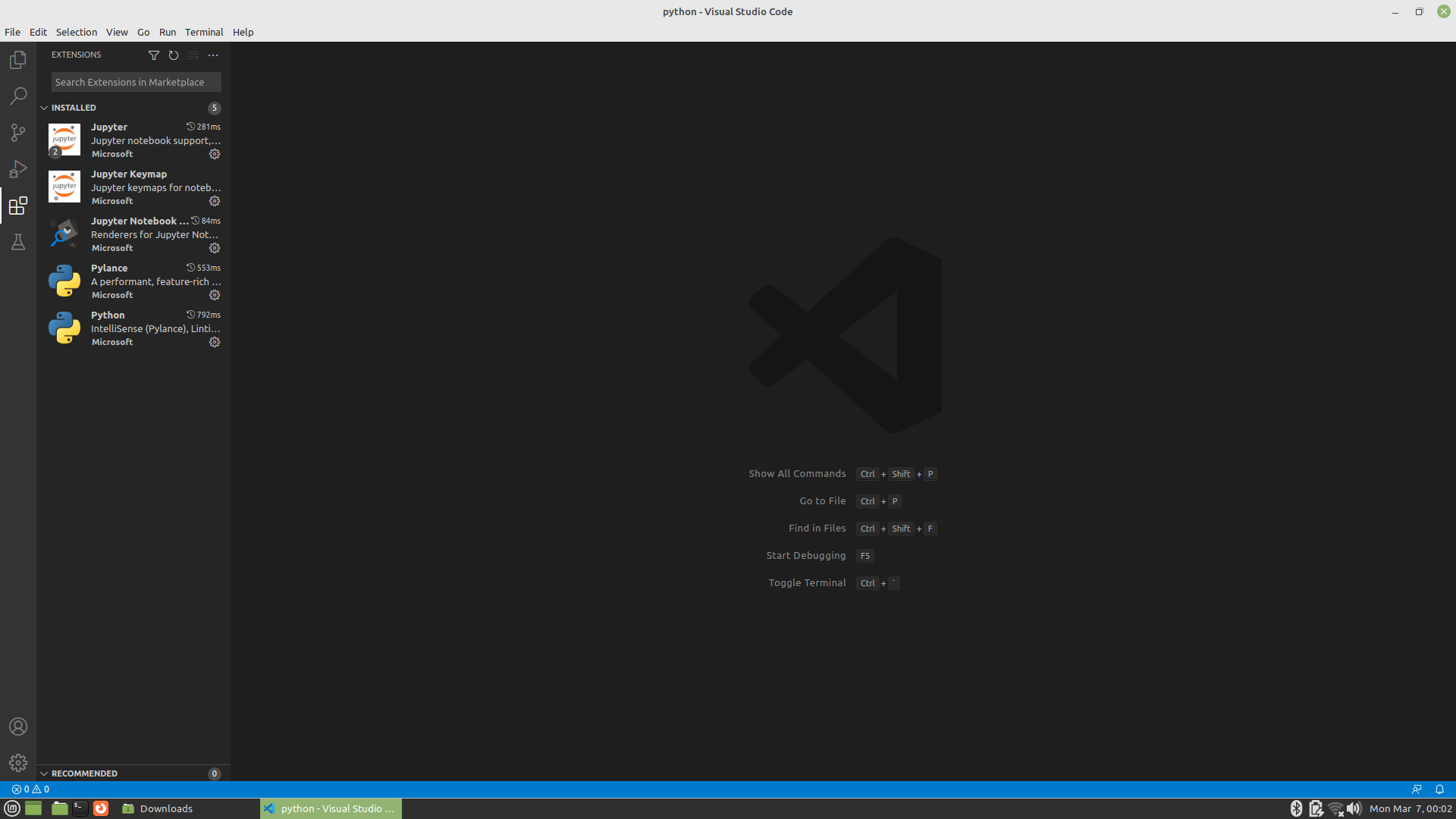 비주얼스튜디오코드를 사용해본 사람이라면 익숙한 인터페이스가 나타난다. 우리는 파이썬을 주로 사용하니 파이썬 확장부터 설치해주자.