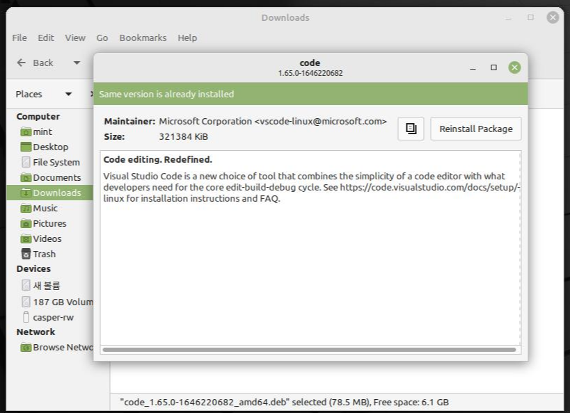 먼저 필자를 비롯한 많은 사람들이 익숙한 코드 에디터인 비주얼스튜디오코드를 설치해보자. 마이크로소프트에서 만든 소프트웨어이지만 리눅스에서도 매우 간단하게 설치할 수 있다.
