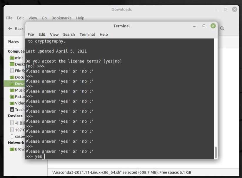 중간중간 yes or no를 입력하라고 하면 yes를 입력해 주고, 수많은 영어 문장들이 나타날 때는 엔터를 계속 눌러주면 된다. 엔터를 누른 채로 있으면 빠르게 넘어간다.