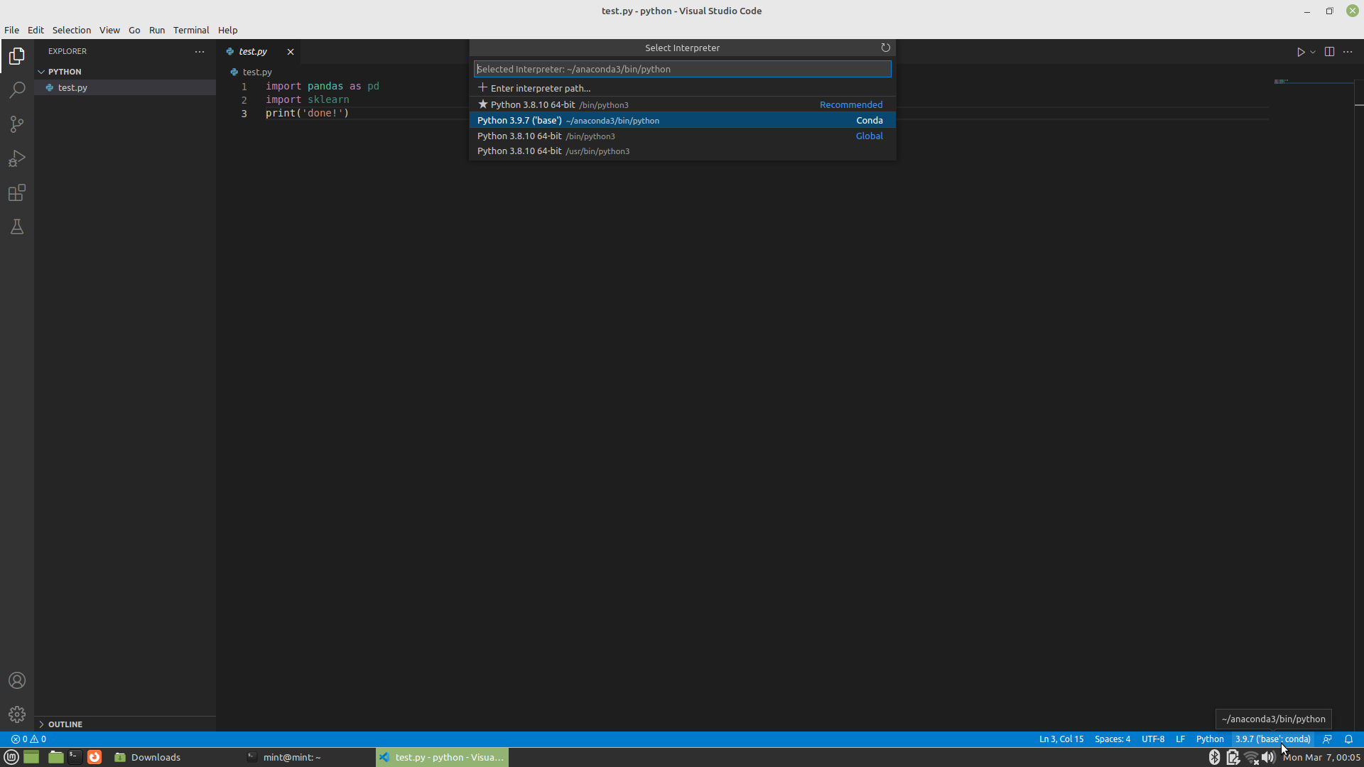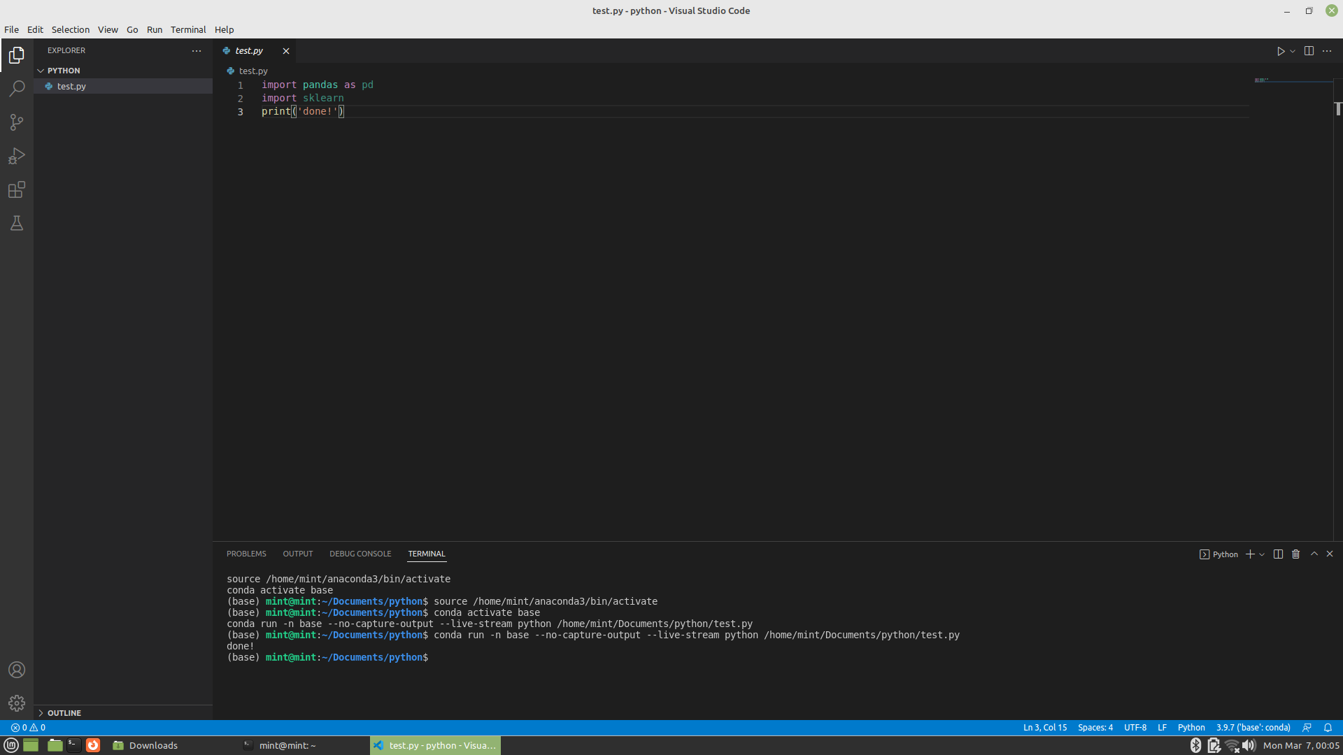 마지막으로 VS Code를 실행해서 파이썬 스크립트를 하나 만들어 실행해 보자. 간단하게 데이터 분석에 자주 쓰이는 라이브러리를 불러오는 코드와 print 구문 한 줄을 작성한다.