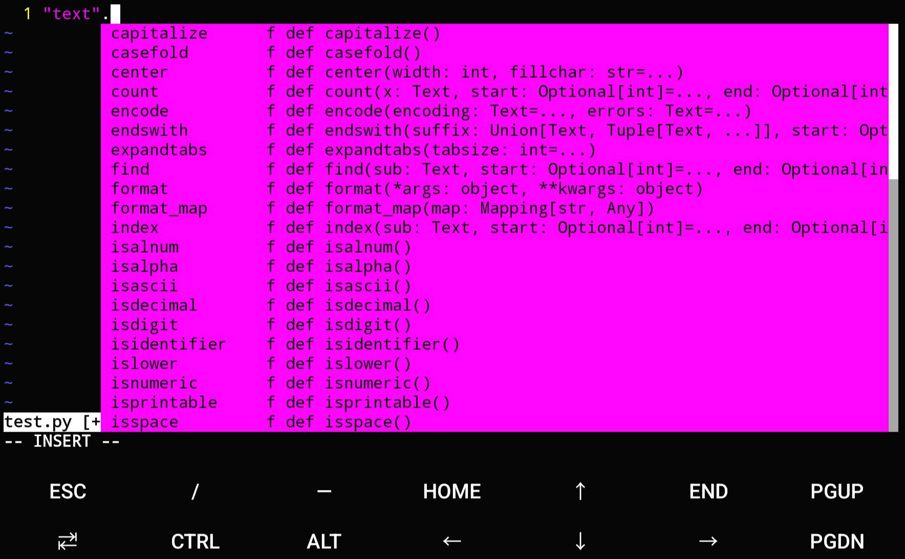 이제 Vim 에디터를 열고 코드 추천이 되는지 보자. vim test.py 커맨드로 파이썬 파일을 하나 열고 아무 문자열이나 입력한 다음 마침표를 찍어본다. 그러면 아래 사진과 같이 문자열 관련 메서드들이 모두 추천될 것이다.