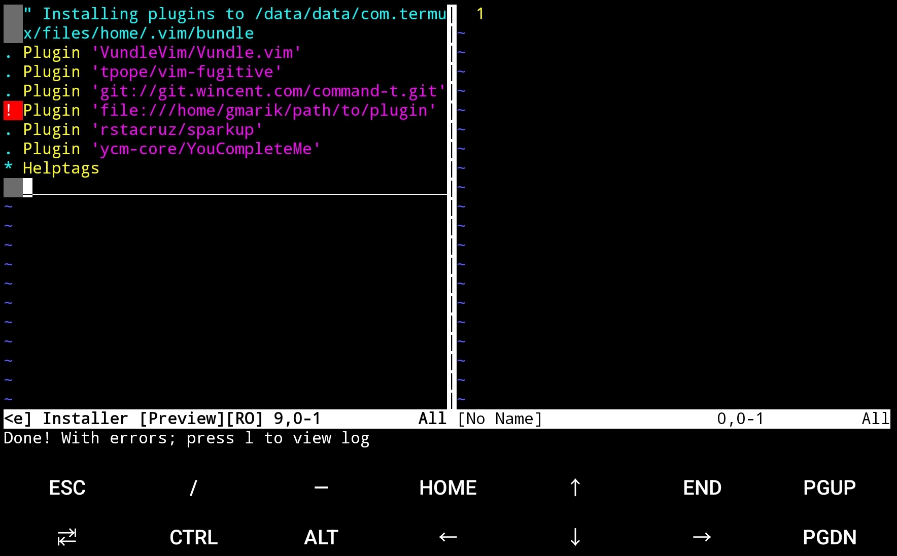 이제 Vim을 실행하고, :PluginInstall 명령어를 입력한다. 그러면 Vim 창이 하나 더 열리면서 플러그인 설치가 진행될 것이다. 설치가 다 끝나면 다음과 같이 설치가 완료되었다는 메시지가 뜬다.