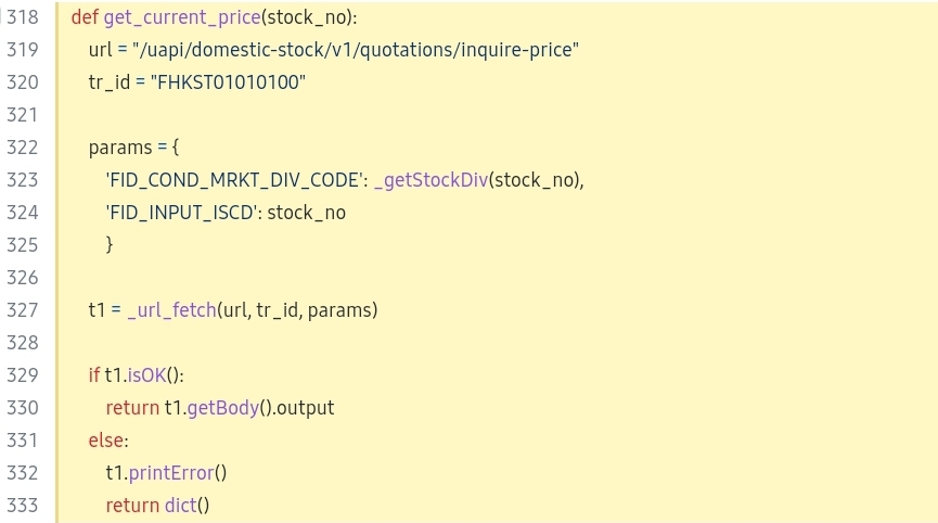해당 파일을 열어 보면 사용자 인증부터 시작해서 주식 현재가 조회 등 API 호출을 할 수 있는 함수들이 정의되어 있다. 매우 복잡하게 보이는데, 우리는 그중 94번째 줄과 318번째 줄에 정의되어 있는 auth 함수와 get_current_price 함수를 사용할 것이다.