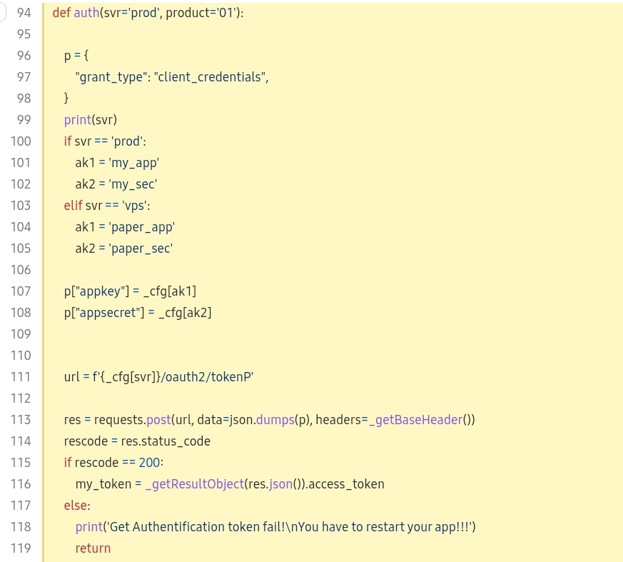 이제 주가 정보를 호출할 준비가 다 됐으니, auth 함수를 이용해서 사용자 인증을 거친다.
