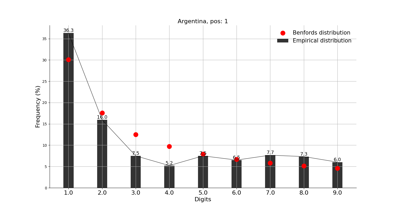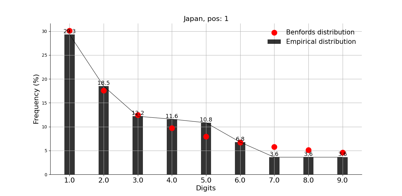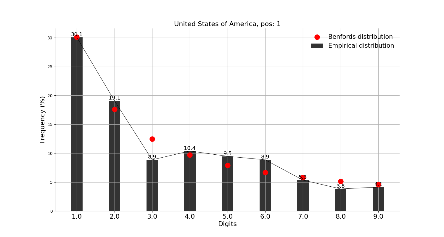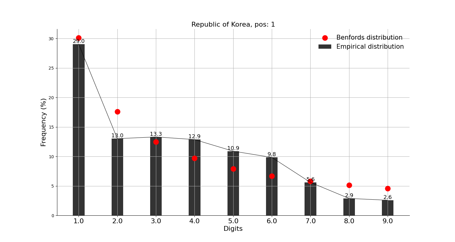 그래프의 빨간 점이 벤포드 법칙에서 말하는 비율이고, 검은 막대가 실제 데이터이다.