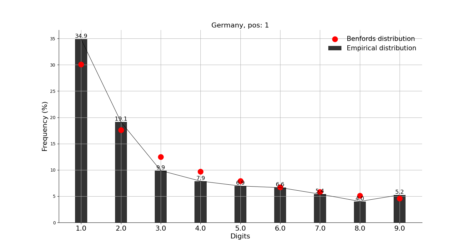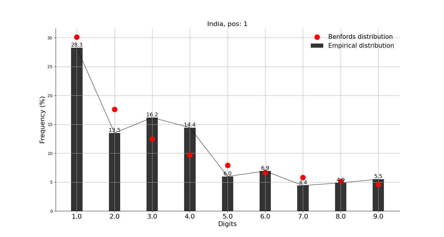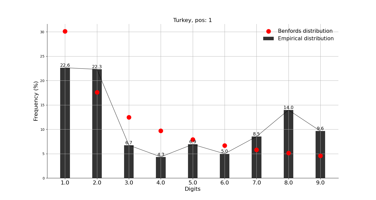 그래프의 빨간 점이 벤포드 법칙에서 말하는 비율이고, 검은 막대가 실제 데이터이다.