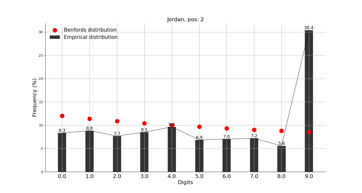 첫번째 자리보다는 벤포드 법칙이 잘 맞지 않아 보여 상위 10개국 분석 결과는 생략하고, 상위 50개국으로 확대하여 눈에 띄는 국가만 추려보았는데, 태국, 베트남, 요르단, 조지아 등 몇몇 국가들의 경우 9가 유난히 많다.