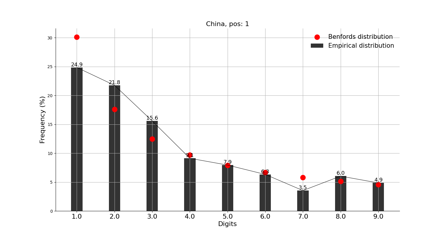 많은 의심을 받고 있는 중국을 포함한 세 나라 모두 벤포드 법칙에 크게 어긋나지 않는 모습을 보인다.